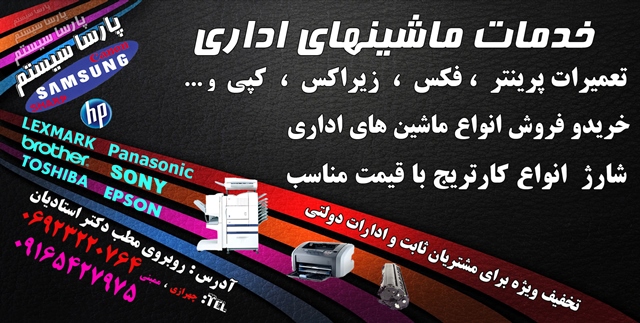 خدمات ماشینهای اداری پارسا سیستم به آدرس فلکه مرکزی شهر روبروی مطب دکتر استادیان آماده سرویس دهی به تمام نقاط استان می باشد . . .